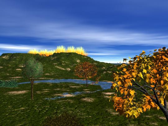 Das Terrain mit dem Gewässer ist dir schon mal sehr gut gelungen. Vieleicht noch etwas Vegetation verteilen (Bäume und Büsche und so) verteilen. Büsche machst du am einfachsten mit kleinen Bäumen aus dem Baumeditor! Blätter klein skalieren und die Anzahl erhöhen (rechte Spalte im Baumeditor). Dann das fertige Teil im Boden versenken, bis der Stamm verschwunden ist!