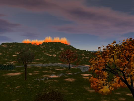 Wenn du Lust zum Basteln hast, könntest du mal probehalber einen dunkleren Himmel nehmen und hinter dem Feuer ein paar Lichtquellen verstecken, sieht bestimmt auch nicht schlecht aus...