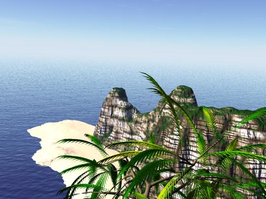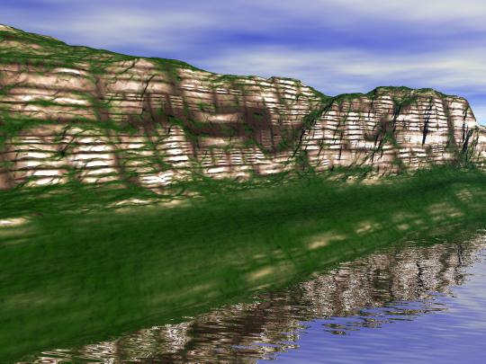 Am Schluss oben auf der Klippe noch kleinere und flache zusätzliche Terrains einbauen und denen verschiedene Gras-mats zuweisen, evtl. hier und da noch echte Gras-obp`s am Klippenrand einsetzen, die schöne Grashalmstrukturen gegen den Himmel abbilden.