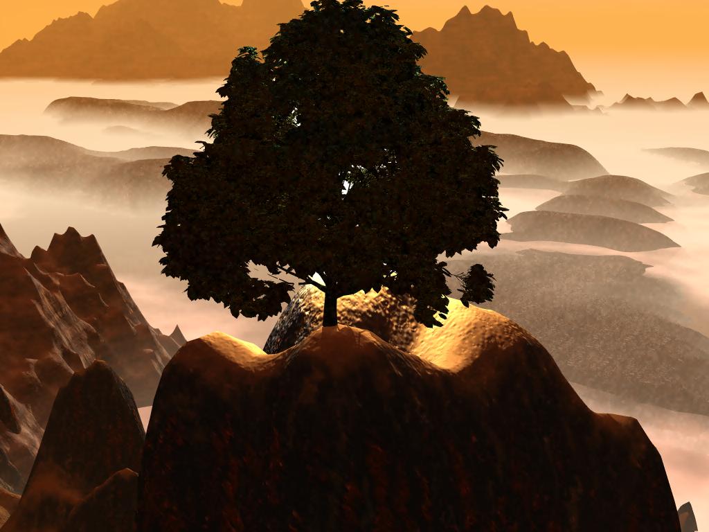 Dennoch liesse sich einiges mehr an Ausdrucksstärke rausholen wenn Du z.B. für die deutlich sichtbaren Texturen eine andere Texturgröße einstellen würdest, oder -vorn der Berg unterm Baum- gleich nochmal eine andere Textur ausprobierst. Letztere will nicht so richtig im Maßstab zum Baum passen, sieht eher aus wie eine Rauhfasertapete. (Nicht bös sein, isnumalso :D)