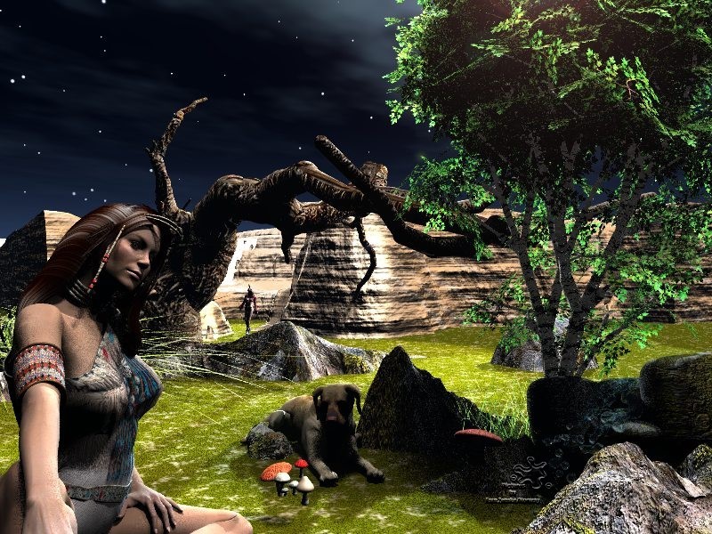 Angesichts des Nachthimmels stellt sich die Frage, wo das helle Licht herkommt. Persönlich würde mir es besser gefallen, wenn vor der Lady noch ein wenig Lagerfeuer zu sehen wäre (nur die Flammenspitzen!) und das Licht mit einem etwas schwächern, gelblichen Radiallicht von dort kommen würde. (Dann würde man auch mehr vom Hund erkennen ;))