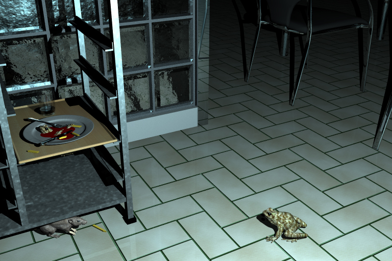 Der Frosch kann sich ja den Pommes oben im Teller widmen und den Mäuschen freundlicherweise noch den einen oder anderen runter schmeissen.