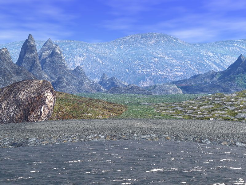 Arbeiten solltest du noch am Stein (der bereits erwähnte Schnitt! ;) ) und am mittleren Gebirge. Bei diesem Gebirge stört mich aber eher die Form. Bei weniger spitzen Zacken würde die Textur sicher besser wirken. Sieht nämlich aus wie Granit, der erodiert eher rundlich.