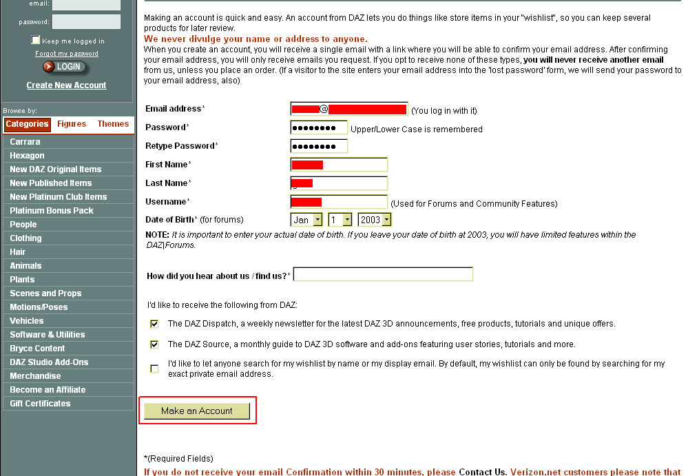 Daten wie email; Passwort (mit Wiederholung) und so weiter eintragen und unten auf 'Make an account' klicken