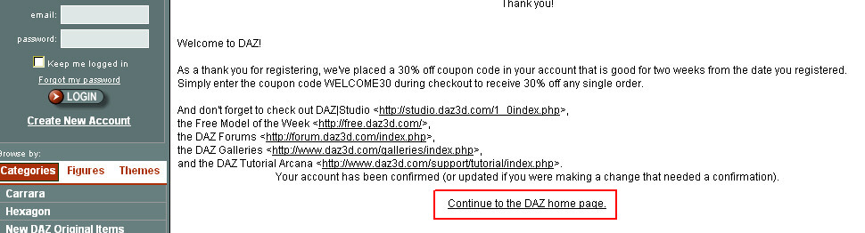 Da kommst du bei DAZ nach dem Klick auf den Aktivierungslink in der Mail raus. Nun noch auf 'Continue to the DAZ homepage' klicken.