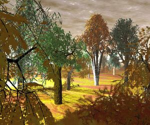Folgende Vorschläge: die 2 dicken dunklen Baumstämme ziehen den Blick zu sehr auf sich, sollten besser etwas schlanker sein, ausserdem käm etwas Gras oder so am Fuß der Stämme auch nicht verkehrt dann sehen sie nicht so glatt "abgeschnitten" aus. Vielleicht läßt sich mit gezielter Beleuchtung noch die Laubstruktur im Vordergrund deutlicher zeigen um dem Ganzen mehr Tiefe zu geben. Oder Du kaschierst das mit den Baumstämmen durch Nebelschwaden (leichte Wolkenebene mit Dunstmaterial über dem Boden)...