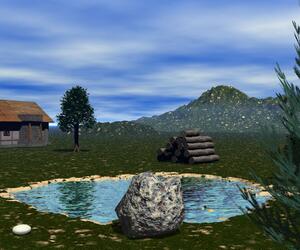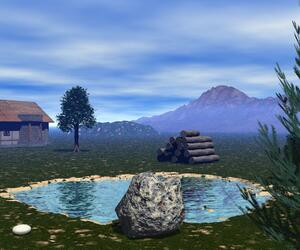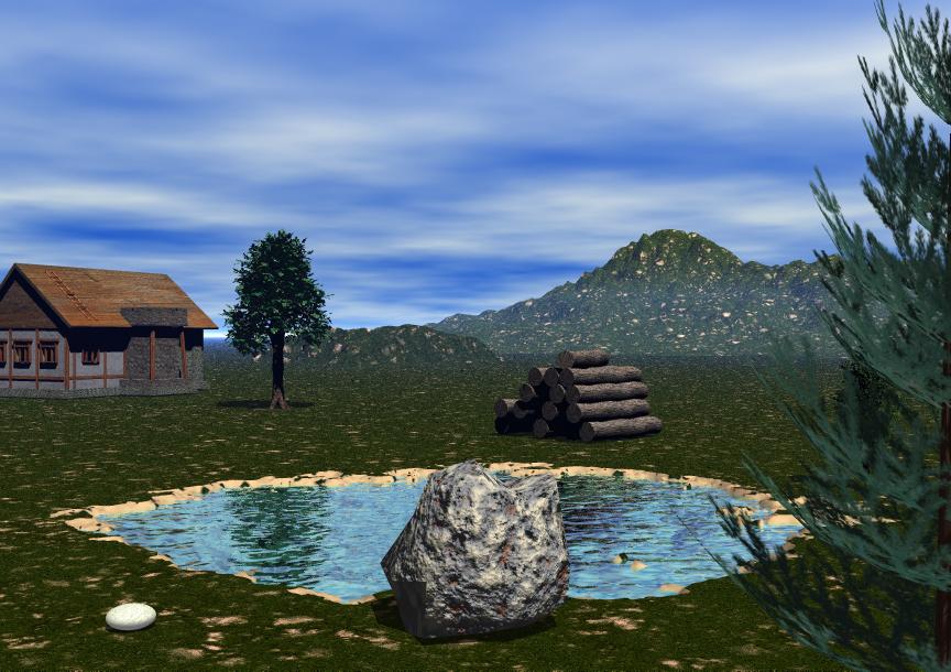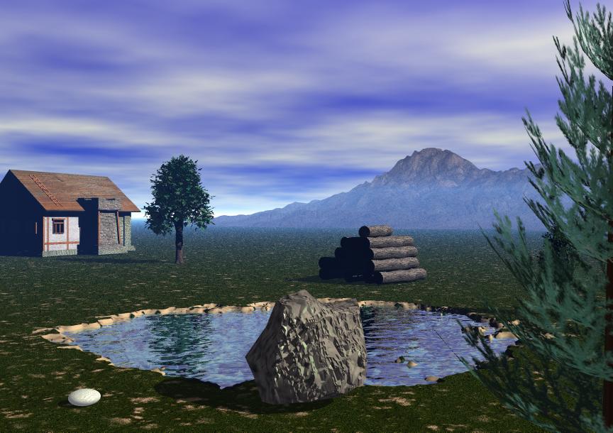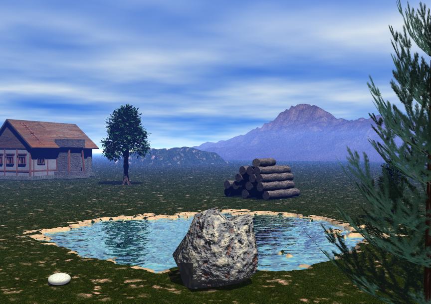Ein sehr schönes Bild hast Du da gemacht. Lediglich die Schatten sind zu hart. Die Vorderseite des Holzstapels und vom Haus sind nicht zu erkennen. Dunst und/oder Nebel scheinen mehr als genug da zu sein wenn man so in den Hintergrund schaut. Probiere mal weiche Schatten in den Einstellungen für die Atmosphäre, oder aber die Reflexionsfähigkeit der Materialien erhöhen.