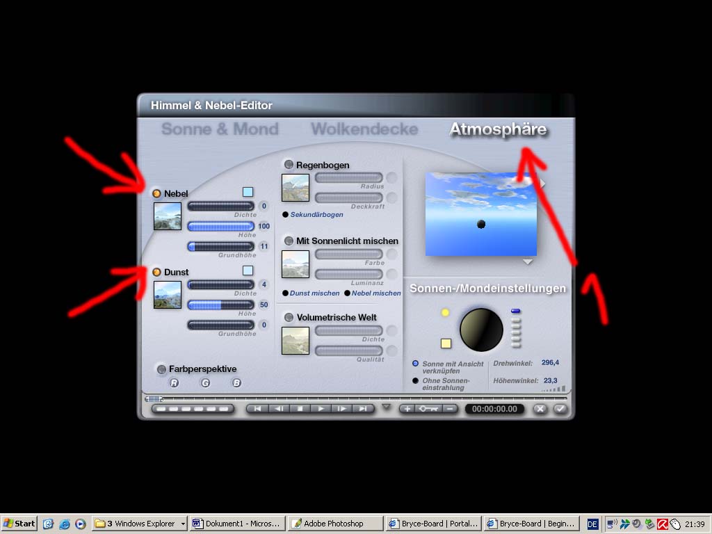 Wie ich den Dunst oder Nebel weniger machen kann, weiss ich nicht. Wie heißt das auf englisch? Hab nämlich die engl. Bryceversion.