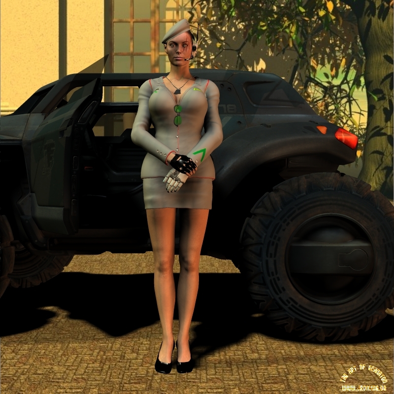 Die Textur der Uniform könnt etwas (ganz leichte, höher aufgelöste) Textil-Struktur vertragen, sieht dann nicht mehr ganz so nach Plastik aus (scheint aber wohl bei Posertextilien generell irgendwie `n Problem zu sein).