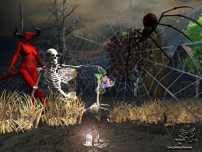 Illustre Gesellschaft, krass dargebracht. Die Spinne ist schon fast zu viel des Guten, könnt mir eher vorstellen dass vom Haus rechts her so`n transparenter Geist anmarschiert kommt (vielleicht doch noch mit Partyzubehör *g*)