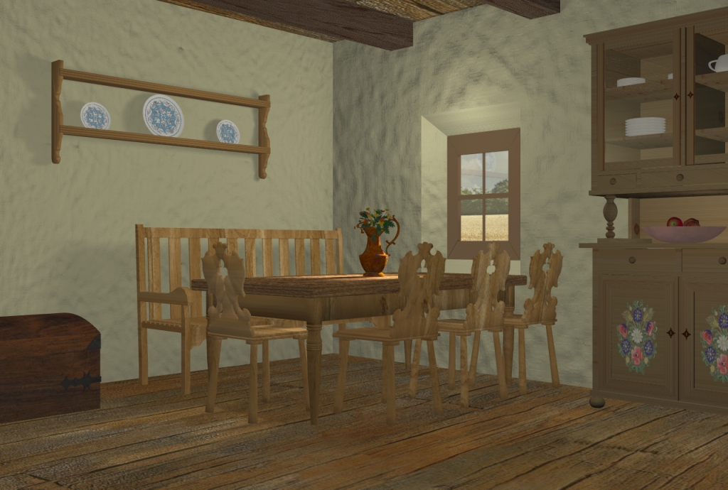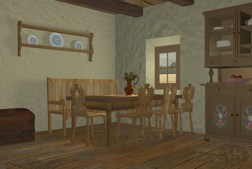 Da ich im Netz nicht die Objekte gefunden habe die ich brauchte habe ich fast alles selbst erstellt. :) Die einzigen Ausnahmen sind die Äpfel, das Teeservice im Schrank und die Blumen.