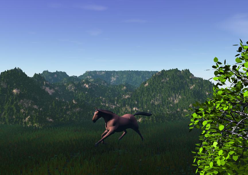 ich hab wieder mal ein Bild zusammengebastelt. Das Pferd ist aus Poser 5, hab ich nur in Bryce importiert. Das Gras hab ich aus einem Terrain gemacht, so wie ich es hier im Forum gelesen habe.