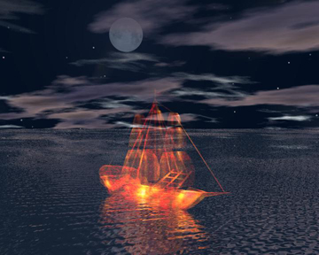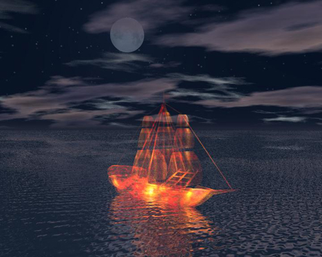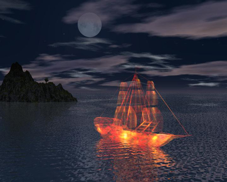 Um das Bild interessater zu gestalten habe ich dann noch ein Schiff, dass ich unter bryceart.de fand (an dieser Stelle vielen Dank; auch für die Tutorials :)), mit einer anderen Textur versehen und auf ein ruhiges Wasser gesetzt.