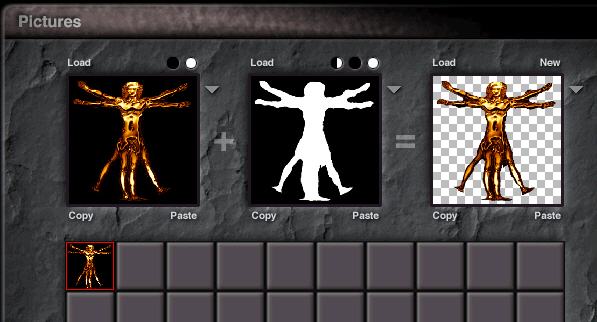 Im Bildeditor (Screenshot B) dann auf eines der leeren grauen Kästchen klicken und die Datei auswählen. Wenn es eine psd, tif oder png-Datei mit einem Alphakanal ist, war's das dann schon. Eventuell musst du nur auf den schwarz-weißen Kreis über dem mittleren Feld klicken, um die Sache umzukehren. Im rechten Kästchen siehst du das Ergebnis. Der grau-weiß karierte Hintergrund bedeutet Transparenz.