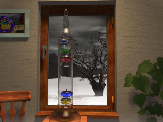 Kaum ist mal Schnee gefallen kommt gleich eine Warmfront und auf dem Boden liegt nur nasser Pamp. Die Glaskörper hat mir ein Freund in seinem 3D Programm gemacht. Der Stuhl ist von Bryceart. Ich habe eine extrem weiche Deckenbeleuchtung gewählt (Renderzeit etwas über 4 h). Am schwierigsten war die Ausleuchtung des Thermometers.