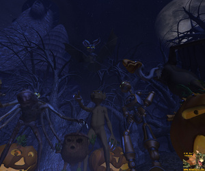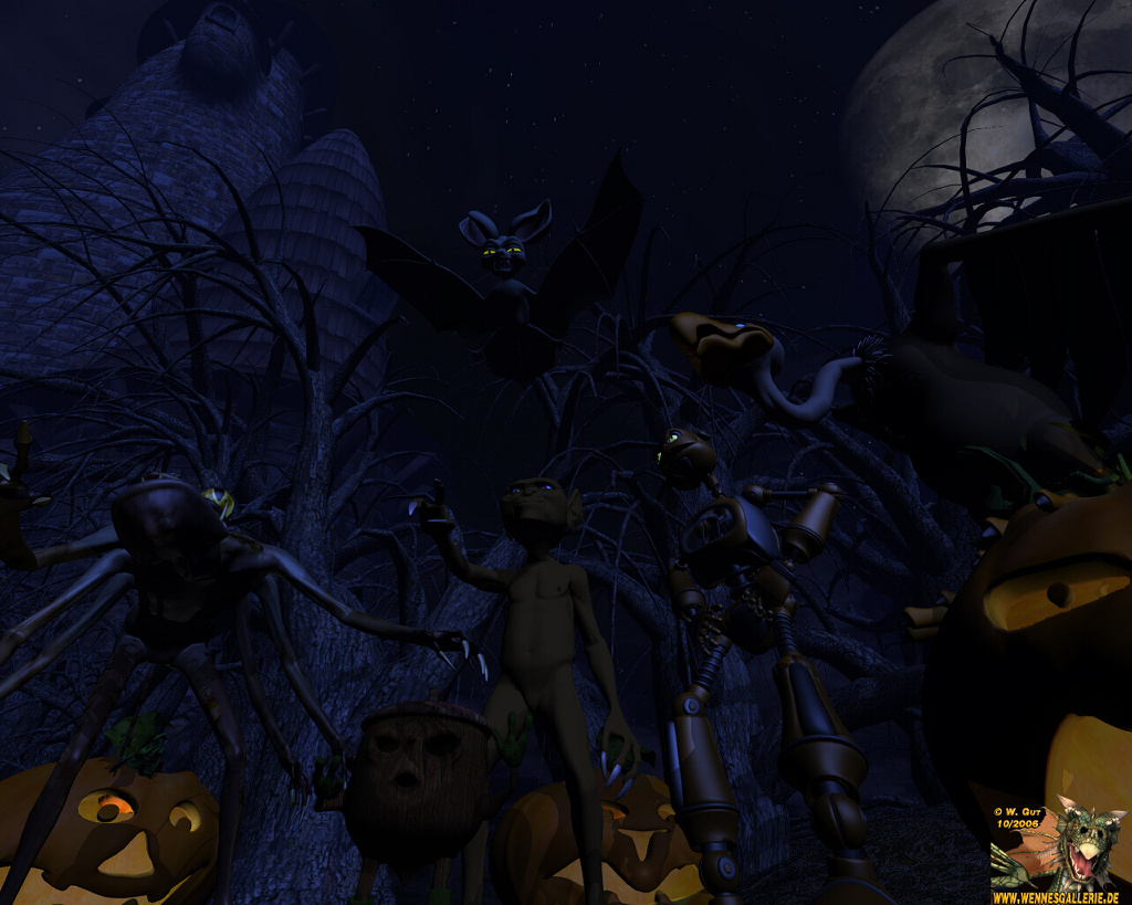 Nachdem der Vorschlag mit dem VolumenLicht in den Kürbisen leider nicht so gut aussah (Gott ist mein Zeuge, ich habs versucht! ;)) habe ich mal als andere Variante noch ein zusätzliches Licht (volumetrisch mit dunklem Blauton) unten hingebastelt und die Gruppe beleuchten lassen. Jetzt ist es nicht mehr so dunkel und man sieht etwas mehr. ![]()