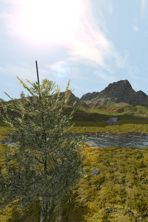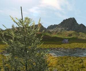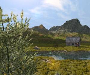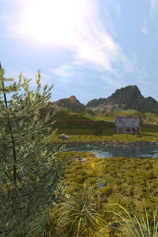 ich habe mir Deine Scene sehr lange angeschaut und ich denke Du hast die besten Voraussetzungen geschaffen für eine tolle alpine Ansicht. Ich kenne Vue überhaupt nicht und weis nicht ob Du meine Vorschläge umsetzen kannst. Zunächst zur Geografie: die Scene ist in einer Höhe von 600 m über NN angesiedelt (da hat auch die Tanne noch ihre Daseinsberechtigung). Zeitpunkt Vormittag im Sommer, Blickrichtung in etwa Ost - Südost(Schattenfall). Auf Grund der Höhe würde ich das Blau des Himmels eine kleine Nuance dunkler gestalten. Die Tanne im Vordergrund würde ich nach links verschieben, zumindest soweit das die Spitze nicht mehr sichtbar ist. Im Vorgrund unten lockern ein paar Grashalme das Bild auf und geben Tiefenschärfe (dürfen aber nicht mehr als 1/8 des Bildes einnehmen). Die Wasseroberfläche des Sees hat zu große Wellen, da stimmt die perspektivische Verhältnismäßigkeit nicht. Sorge für ein ruhiges etwas dunkleres Wasser. Das Haus im Hintergrund habe ich Anfangs für einen Felsen gehalten. Das musst Du vergrößern und vielleicht etwas Drumherum dazugeben almmäßig. Und zu guter letzt würde ich einige Felsen durch das Grün der Bodentextur ragen lassen.