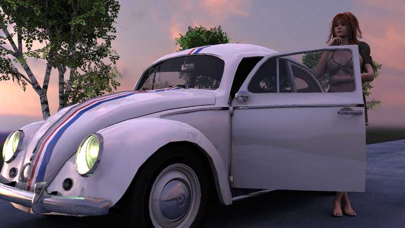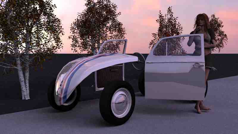 Bild2 ist mit der selben Map und den selben VW und Vicky gerendert. Ihr könnt Euch sicher vorstellen, daß ich ein wenig erstaunt war nachdem Bryce mit dem Importvorgang fertig war..... Ich habe mehrmals versucht den VW komplett in Bryce zu bekommen.. ohne Erfolg, es gab keine Fehlermeldung. Der Strassenbelag in Bryce ist keine Textur wie in Vue, weil B6 jedesmal beim Erstellen der Textur abstürzte. Dann beachte man den Schatten, der kommt aus der verkehrten Richtung, wie man an der Spiegelung am neuen Cabrio vorn sehr gut sehen kann, die hellste Stelle der Map ist links !!