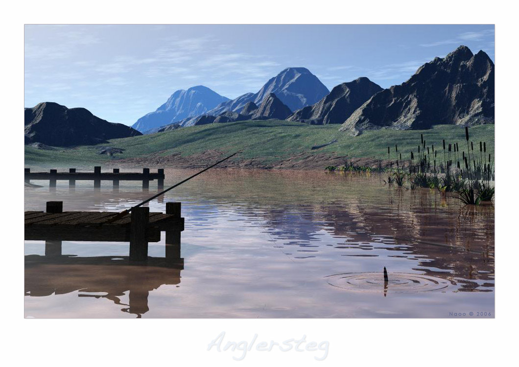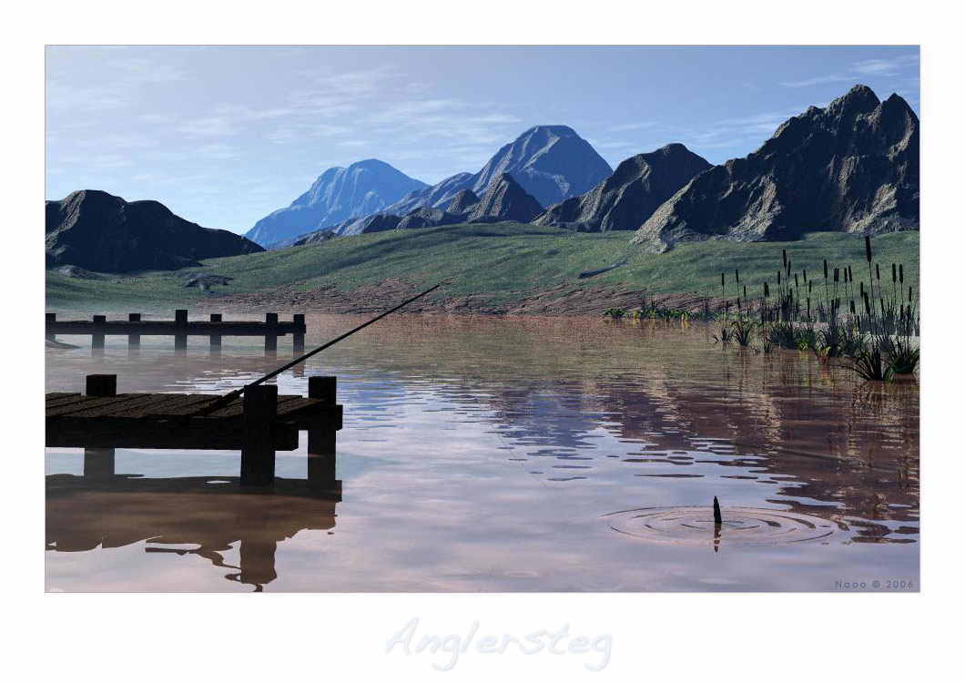 Cooles Bild! Die Komposition gefällt mir sehr gut. Der Vordergrund ist Top, die Wellen um die Angel geben dem ganzen einen ziemlich realistischen Touch. Gelungen finde ich auch den Übergang Wasser-Ufer-Landschaft.