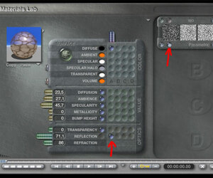 Bild2 zeigt die Einstellung der Auswirkung wenn Du einen zusätzlichen Materialkanal benutzt (es entsteht eine blaue kleine Kugel wenn Du in die Vertiefung rechts vom Parameterschacht klickst, die Dir anzeigt dass Du den ersten Kanal aktiviert hast - andernfalls kannst Du keine Einstellungen für diesen Kanal vornehmen) In meinem vorliegenden Beispiel hab ich dem Metall aus Bild 1 eine importierte Textur mit Caustics-Muster zugewiesen, die Parameter hierfür müssen dann in oben beschriebenem ersten Kanal eingestellt werden.