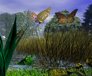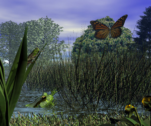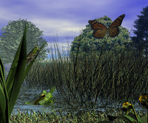 Die Perspektive ist sehr gut gewählt, der Frosch der so lustig aus dem Wasser lugt ist allerdings etwas zu leuchtend grün, der sieht so noch ein wenig unecht aus. Vielleicht könnte man den auch noch glänzen lassen, er ist ja nass (Beim auch seehr grünen Gras im Vordergrund kann man das damit erklären dass dort Sonnenstrahlen auftreffen).