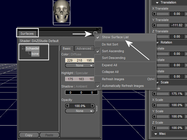 Zweckmäßig ist es, das Surface-Fenster so einzustellen, dass die Surface-List angezeigt wird. Dazu rechts am Fensterrand auf das Dreieck klicken und ein Häkchen vor "Show Surface List" machen. (Bild 1)