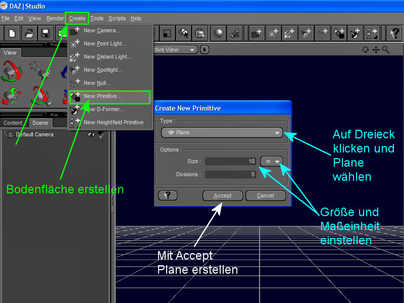 Bild 1: Bodenfläche erstellen, falls keine in der Szene vorhanden ist. Dazu unter Create --> New Primitive --> Plane wählen.