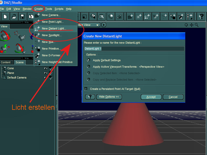 Bild 1: Bodenfläche erstellen, falls keine in der Szene vorhanden ist. Dazu unter Create --> New Primitive --> Plane wählen.
