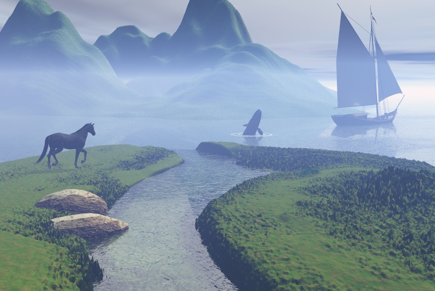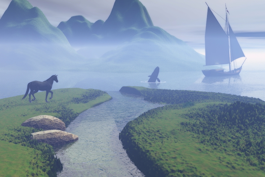 sehr schön gestaltete Scene mit weichem Licht. Die Insel würde ich auch steiniger machen, zumindest nach oben hin. Was ein bischen stört ist der gerade Verlauf des unter Wasser liegenden Terrains im Flusslauf. Vielleicht kannst Du den noch etwas abschneiden.