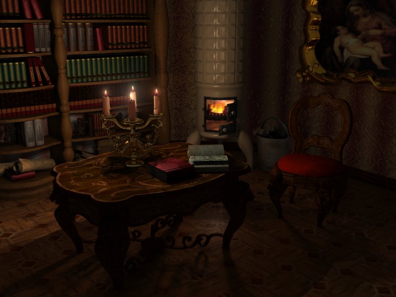 Beleuchtung find ich super! Speziell den Parkettboden und das ganze andere Interieur find ich mehr als gelungen, außer die Säulen bei dem Bücherregal, die passen vom Stil her nich so zum Rest der Einrichtung, find ich. Mich würd mal ineteressieren was Du hier alles selbstgemodelt hast, das sieht alles ziemlich gut aus - Hut ab.