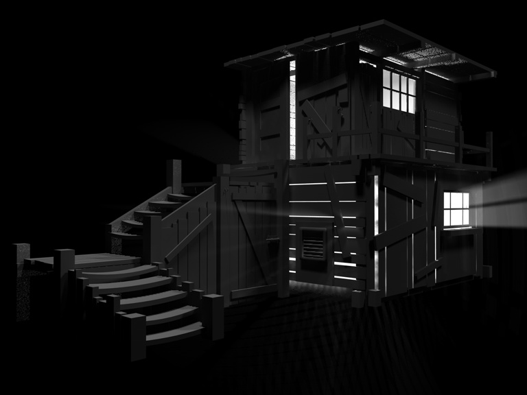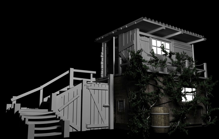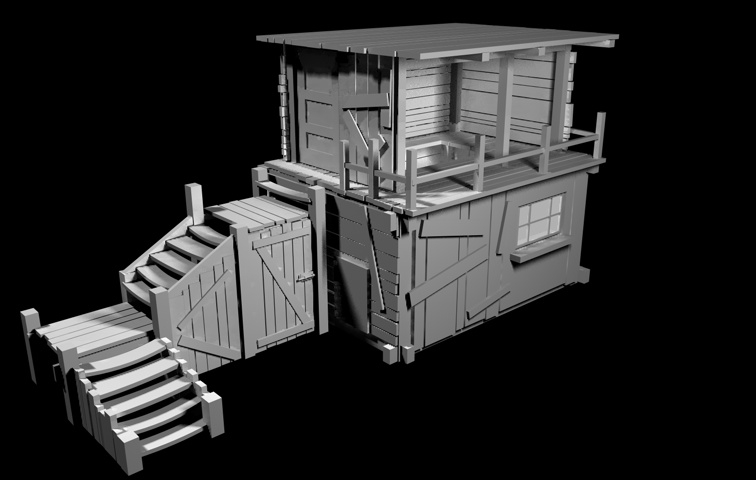 Vielleicht noch eine schiefe Sitzbank vorm Haus? Oder eine alte Regentonne? Auf der Außenseite der Stiege würde vielleicht auch ein wackeliges Geländer hinpassen.