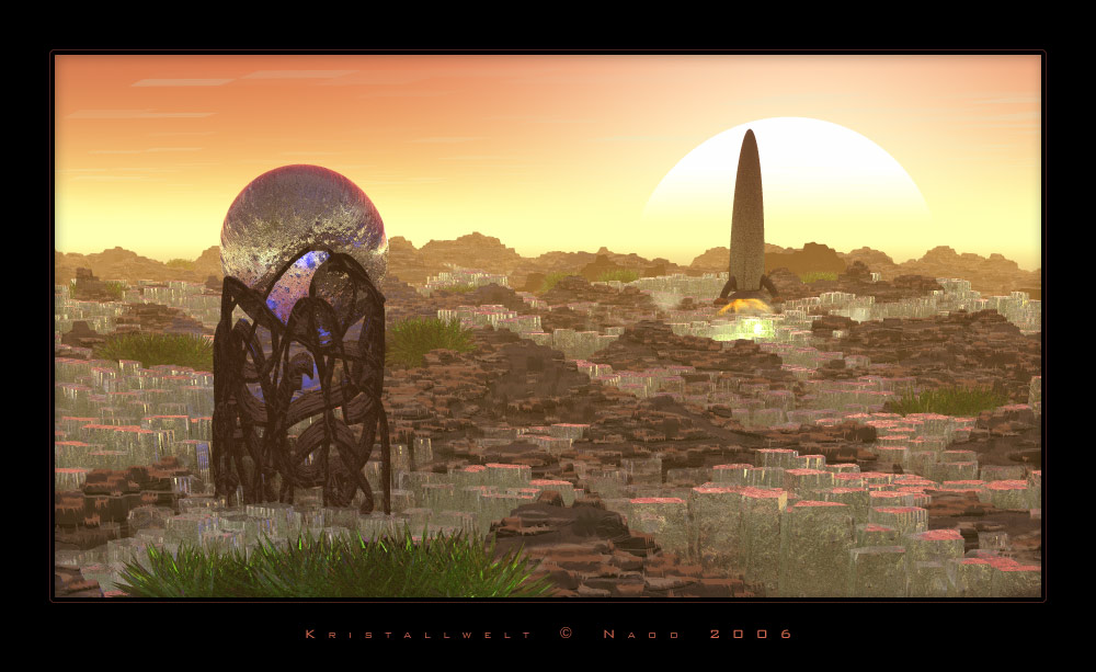 Nach der Landung war der Boden unter dem Raumschiff geschmolzen und glatt wie Eis. Die Luft war dünn und kratzte mit jedem Atemzug im Hals. Jeder Schritt ließ den gläserne Boden unter unseren Füßen klirrend bersten. Sogar die spärlichen Gräser waren aus Glas. Wir hielten uns in dieser unwirklichen Umgebung nicht lange auf, zumal es uns nicht gelang den Sinn oder den Ursprung der blau schimmernden Kugel zu erfahren.