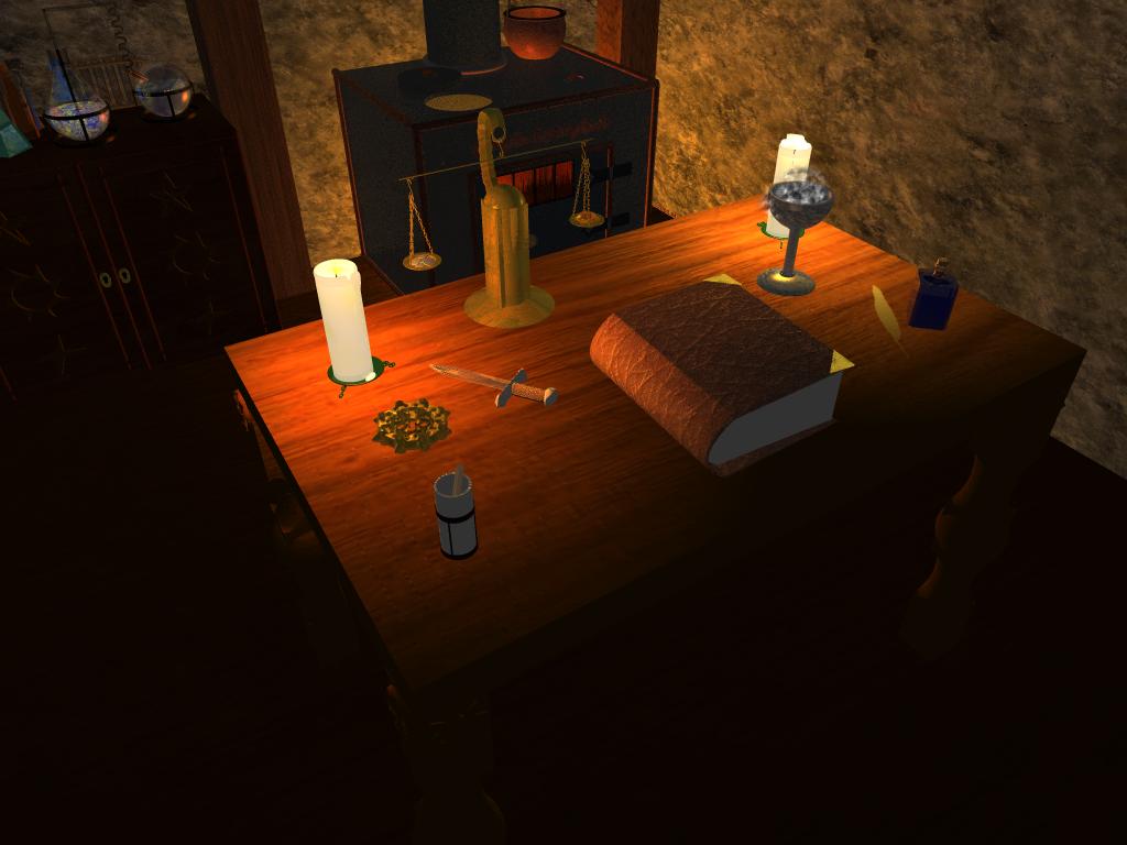 • Die Lichtquellen der Kerzen liegen eigentlich genau oben auf den Kerzen. Nach unten kann an sich kein Licht fallen, wegen der Kerze selber. Ich müsste wohl den Falloff erhöhren, oder die Intensität, was die Kerzen zu hell machen würde. Ich denke der gesuchte Schatten ist wirklich unter den Kerzenständern und gehört zu den Bereichen, die man nicht sieht, wie z B die untere Ofenverzierung (man erkennt ja nichtmal, dass es eigentlich Blätter sind und die ünzen ja auch nicht wirklich, schade die haben nämlich ne Prägung bekommen ^^) Obwohl... Müsste mal schauen ob Cast Shadows an ist. Das dauert nur immer. Ich hab ein wenig die Grenzen von meinem Rechner + Bryce kennengelernt. 1377 Objekte und Bryce braucht dann schon einige Sekunden bevor ich aus den Materialmenüs wieder rauskomme. *g*