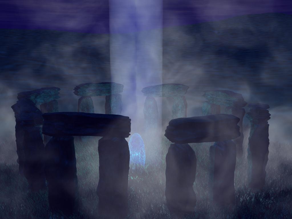 So drehte ich mich um und drang tiefer in die Landschaft aus sanften Hügeln vor, mit jedem Schritt den ich auf dem Gras tat bekam ich das Gefühl nach Hause zu gehen, anstatt in die Fremde. Ein Gefühl der Heimkehr, als würde ich alles hinter mir lassen was ich nicht brauche und mich nur belastet hatte. Mit jedem schritt schaltete mein Verstand mehr aus und ich folgte nur noch jenem Instinkt, jener inneren Stimme die mich leitete. Ich weiß nicht wie lange ich gelaufen bin, nur dass der Nebel immer dichter wurde und leichte Schleierwolken aufzogen, während die Nacht sich ausbreitete. dicke Nebelschwaden wogten um mich herum, tanzten einen Tanz der mich einlud mit ihnen zu gehen, machten keine Angst sondern verstärkten diesen ursprünglichen Instinkt in mir. Letzten Endes sah ich mein Ziel. von einer Hügelkuppe aus blickte ich hinab auf einen Steinkreis, tief im Nebel versunken, umspielt, umtanzt und doch schien dieser Nebel direkt von ihm auszugehen. Es zog mich zu ihm, er rief nach mir, lud mich zu sich sein. Auf halbem Weg hinab hielt ich jedoch erschrocken inne. Ein blaues Licht breitete sich in ihm aus, beschien die großen Steine auf eine Art, als würde sich das Licht um sie legen, oder von ihnen ausgehen, bis es in der Mitte einen kreis formte. Ungläubig beobachtete ich diesen Kreis aus Licht, widersprach er doch allem was ich kannte und gelernt hatte, es durfte ihn nicht geben, doch die Stimme in mir sprach nur "vertraue...". eine Säule aus Licht schoss empor aus diesem Kreis und mit ihr ein weiteres Licht aus dem Boden. Wie eine mischung aus flüssigem und kristallinem stehendem Licht tat sich ein Tor auf, welches aus dem Boden ragte.