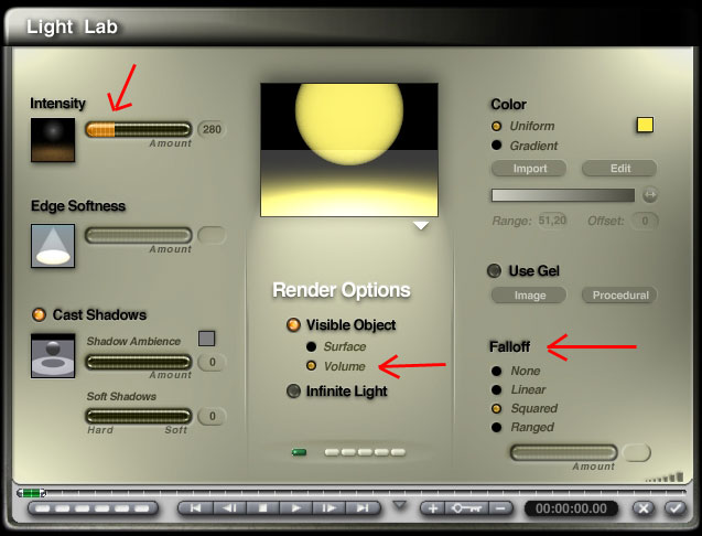 Dazu hab ich ein 'Radial Light' von Bryce genommen, es in X und Z-Richtung zusammengestaucht und dann im 'Lichteditor' mit einem proceduralen Gel versehen.