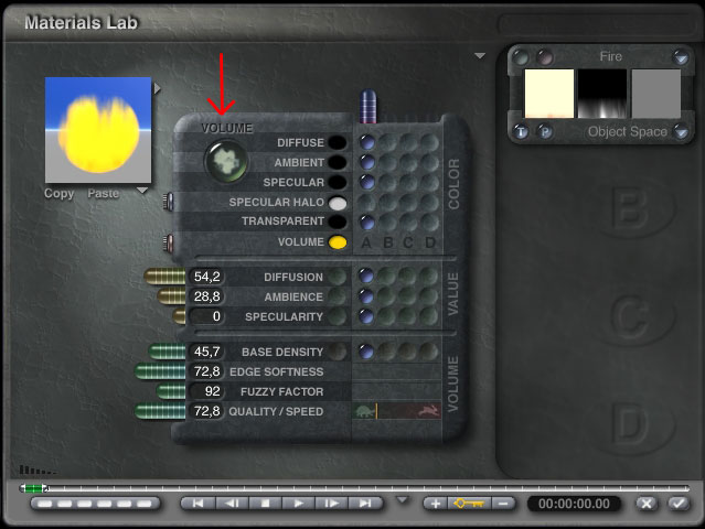 Basis ist das (nichtvolumetrische) Feuermaterial aus den Presets, bei dem ich im Textureditor die Rot-Komponente in ein orange umgewandelt habe.