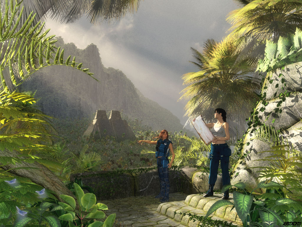 Die Schmetterlinge sind gepostworkelt, der Rest iss komplett in Vue gerendert.Die Mädels hab ich in Poser angezogen und geposed. Den Vordergrund und die Pyramide hab ich mit Cinema und Zbrush zurechtgeknetet und in Bodypaint bemalt. Der Rest iss Vue.