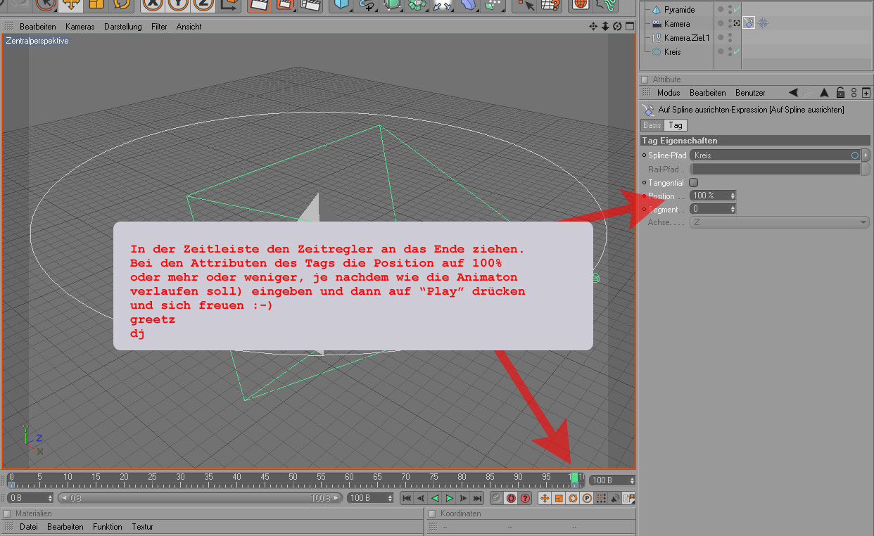auf diesem Kreis eine Kamera um die Pyramide fahren lassen.