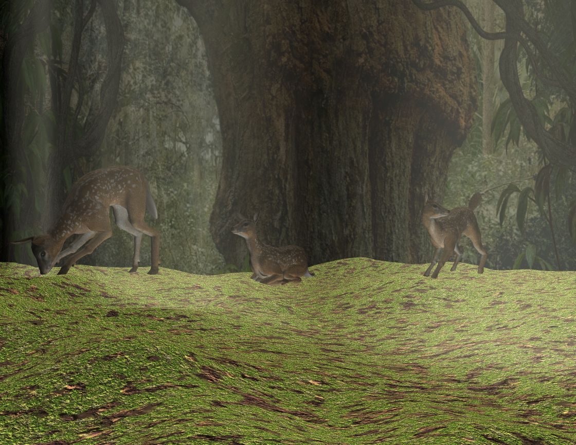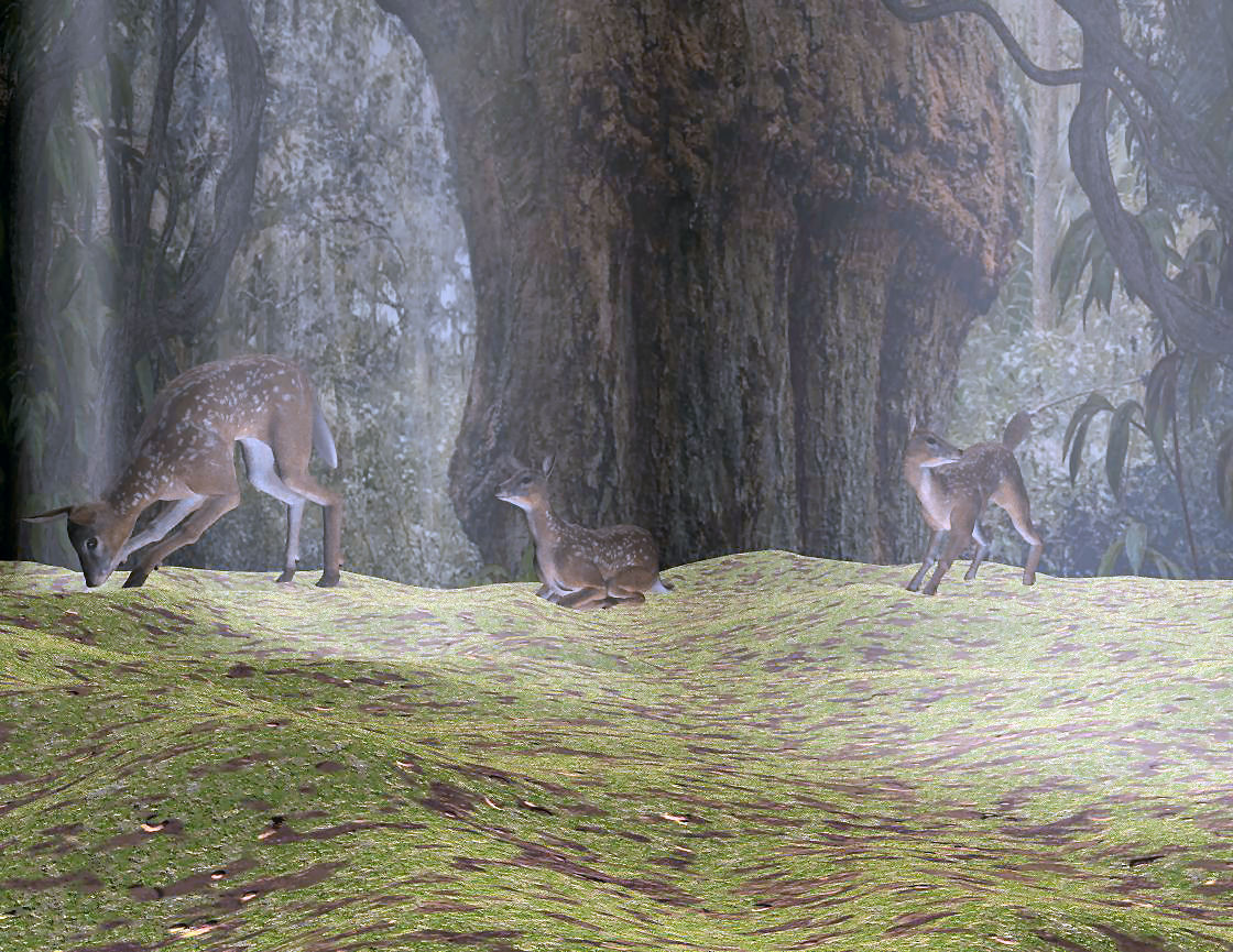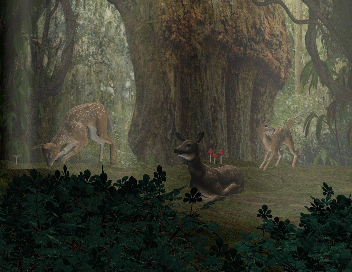 Jaaa, jetzt ist es richtig heimelig. Das Grünzeug und die Pilze geben dem ganzen etwas märchenhaftes. Auch das Reh, das du jetzt weiter im Vordergrund plaziert hast, kommt viel besser, weil es jetzt so schönes Licht hat.