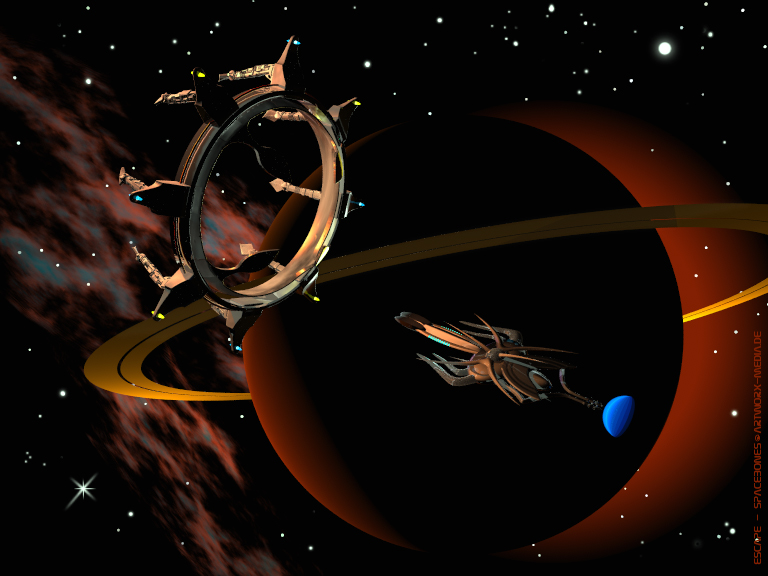Aus der unergründlichen Schwärze im Kernschatten des Gasriesen lösten sich die Konturen des kleinen Transportschiffes, dessen Hülle flackernd das Inferno planetarer Zerstörung reflektierte. Bange Sekunden liessen die Crew den Atem anhalten. Würde das Sprungtor rechtzeitig bereit sein? Nur noch eine Lichtminute entfernt raste eine gigantische Wolke ionisierten Gases unerbittlich heran, einem kosmischen Tsunami gleich, die äusseren Welten dieses sterbenden Sonnensystems waren ihr bereits zum Opfer gefallen. Die Evakuierung der Welten war erfolgreich abgeschlossen worden, nur -wie so oft- für das Rettungspersonal wurde es wieder einmal ein unerbittlicher Wettlauf mit der Zeit...