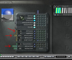 am besten Du lädtst irgend ein Wassermaterial aus der Bibliothek und spielst einmal mit folgenden Reglern. Dann siehst Du gleich selber wo der Hase lang läuft... ( Bilder sagen ja bekanntlich mehr als Worte...) :D