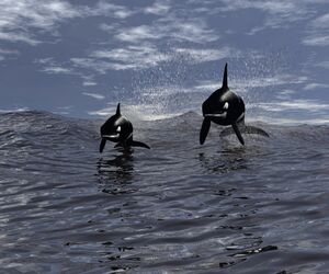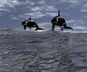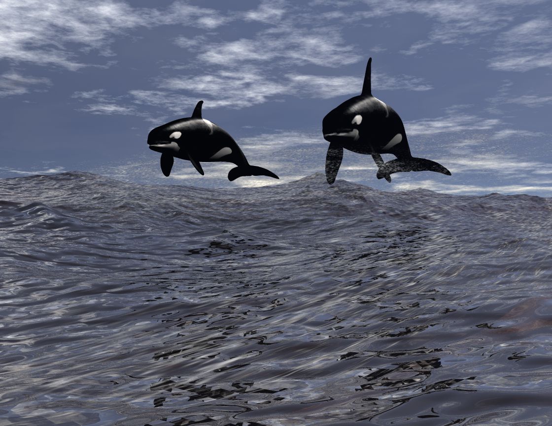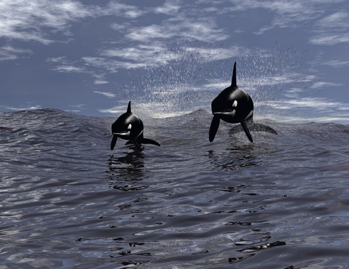 Die Wale sind nicht geklont , ich hab das weibliche Tier trotzdem ein bißchen gedreht. Ausserdem noch mehr und größere Wasserspritzer gesetzt und auch die Schwanzflossen etwas tiefer gesetzt.