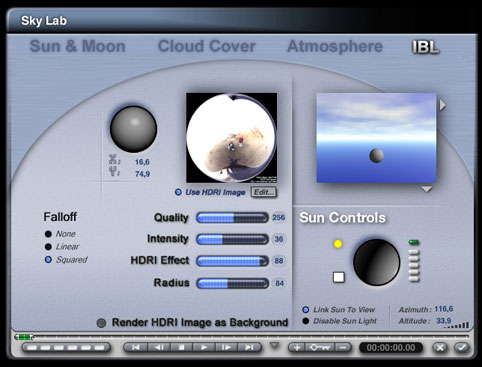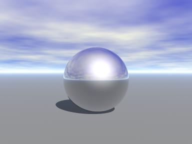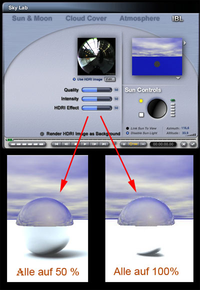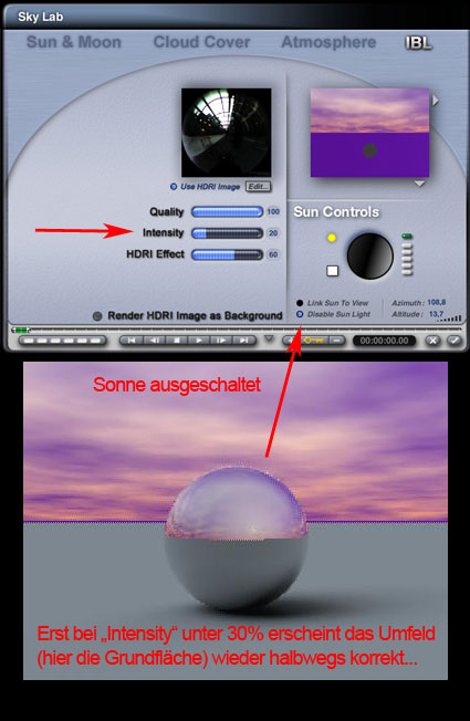 Testrender mit dem neuen HDI "Editor": simple Kugel erstellt, Metalltex drauf, HDRI Probe geladen, Einstellungen erstmal als Richtwert alle auf 50%, Sonnenlicht ausgeschaltet und *Kreisch* - die Kugel sieht gut aus, aber der neutral-bryce-graue Untergrund ist strahlend weiss! So weiss wie es kein Waschmittel schafft! Überstrahlt die Kugel von unten her, oben dagegen ein trüber bewölkter Tag, der es ja laut Probe auch sein soll...