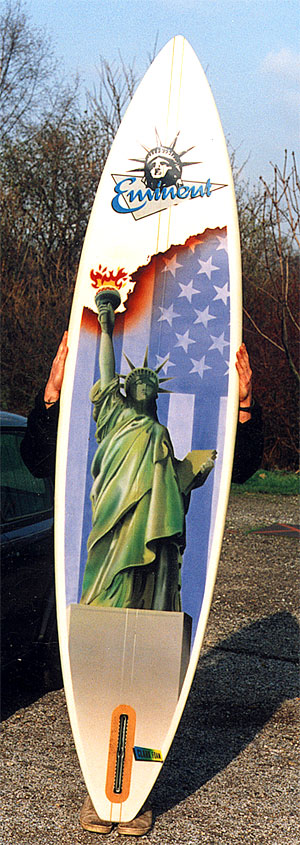 Die anderen Motive sind -wohl unschwer zu erkennen- echte Airbrush-Arbeiten auf Objekten (ebenfalls private Kundenaufträge). Die Motorhaube war für einen Oldtimer Club und stammt von einem Citroen DS21. Das Logo auf dem Surfboard ist KEINE Schleichwerbung, diese Firma existiert schon länger nicht mehr... ;) :hat2