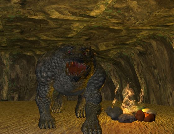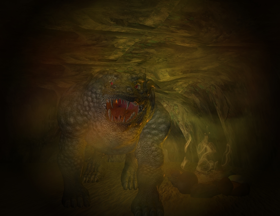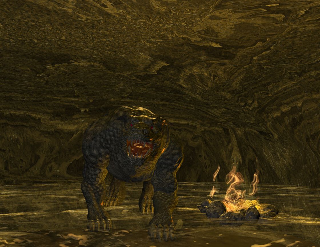 Bei der letzten Variante frag ich mich was dessen Buckel so hell beleuchtet... das müsst ja eigentlich dann auch nen Reflex an die Höhlendecke werfen, zumal sie so dicht über ihm ist..?