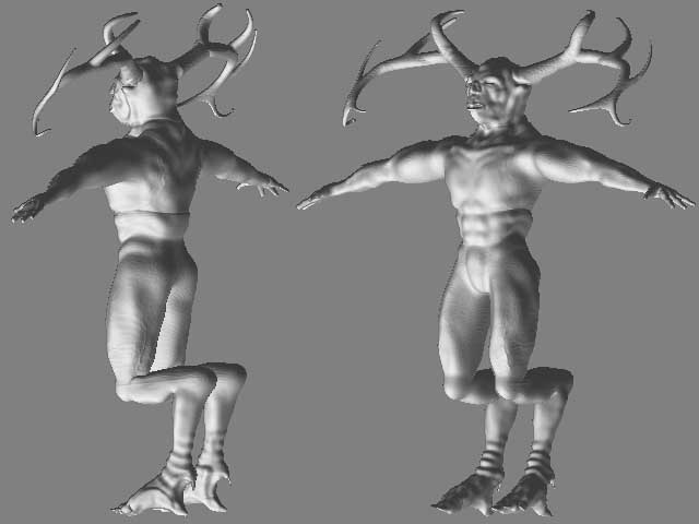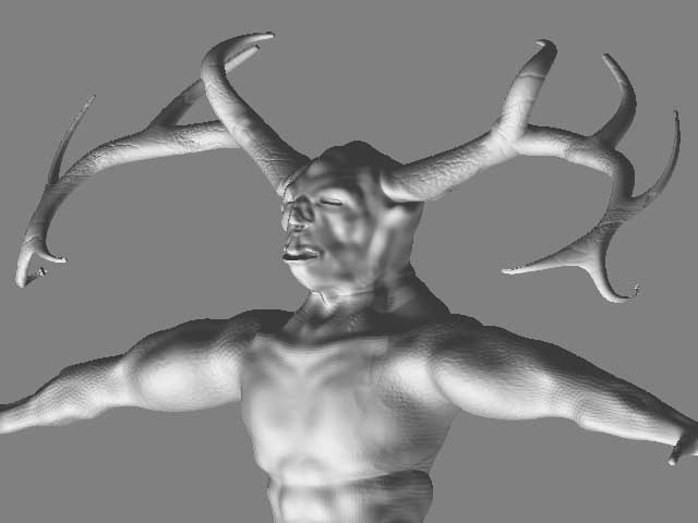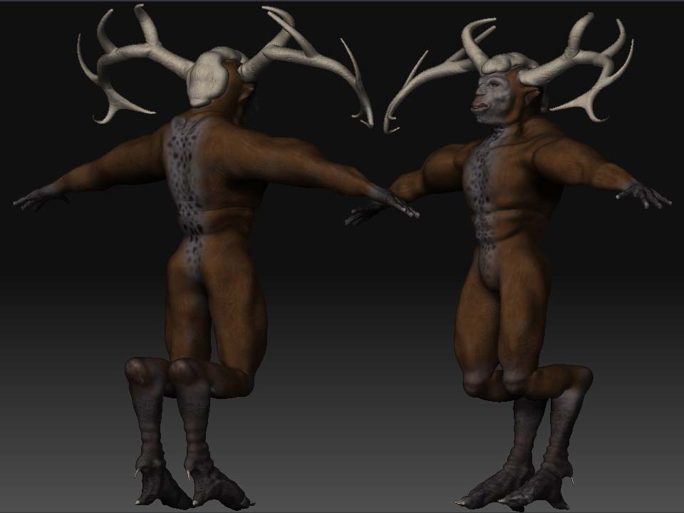 Stocko, Dein Charakter bzw. der Kopf sollte vieleicht mehr animalisch wirken, mit der Tendenz zum Rotwild oder Hund. Bekommst Du da noch son Stück Hirn, das aus dem Geweih oder Schädel guckt, gebacken? Ich weis, ich weis, ist extrem schwer das so umzusetzen. Sieht aber garantiert edel aus.Die Füsse wird ich auch nicht unbedingt im rechten Winkel abknicken. Wie wärs stattdessen mit drei Füssen. Das mein ich ernst. Vieleicht eines von den dreien einwenig zurückgebildet.