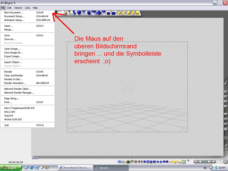 und hier nun meine oberfläche nach dem öffnen - ich denke da gab es schon ein problem bei der installation, denn so wie bei euch schaut das bei meinem bryce leider gar nicht aus - da klappt sich kein menü oder ähnliches aus!?!? hat von euch jemand erfahrung mit dem kostenlosen bryce5 download?