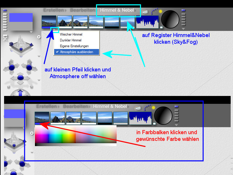 Hier der Screen, wie man die Atmosphere ausblendet und einen einfarbigen Hintergrund bekommt. Bei Bedarf die Bodenebene löschen....