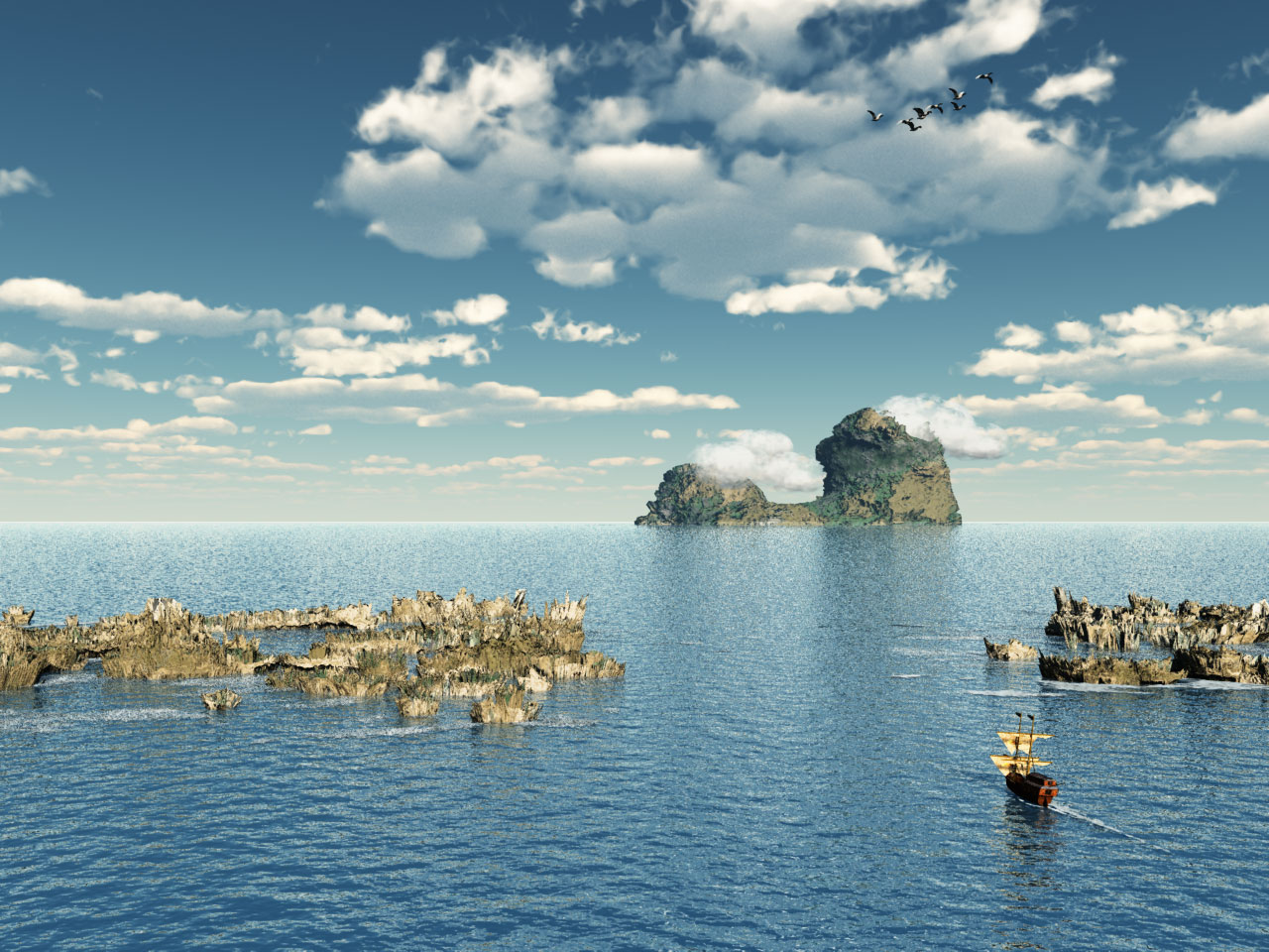 Kommt prima rüber, nur bei der grossen Insel hinten würd ich versuchen noch mehr die optische Distanz zu betonen, nen leichten Dunstschleier davor, oder generell etwas diesiger machen. Für die Horizontsituation schaut die Insel in der Entfernung nämlich bissel zu klar aus...