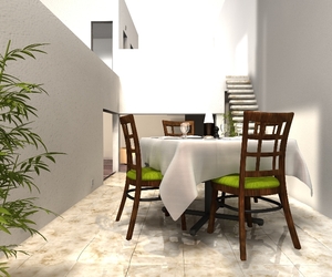 Allerdings scheinen die Moebel zu schweben, weil die Schatten unter den Stuhlbeinen durchgehen.
